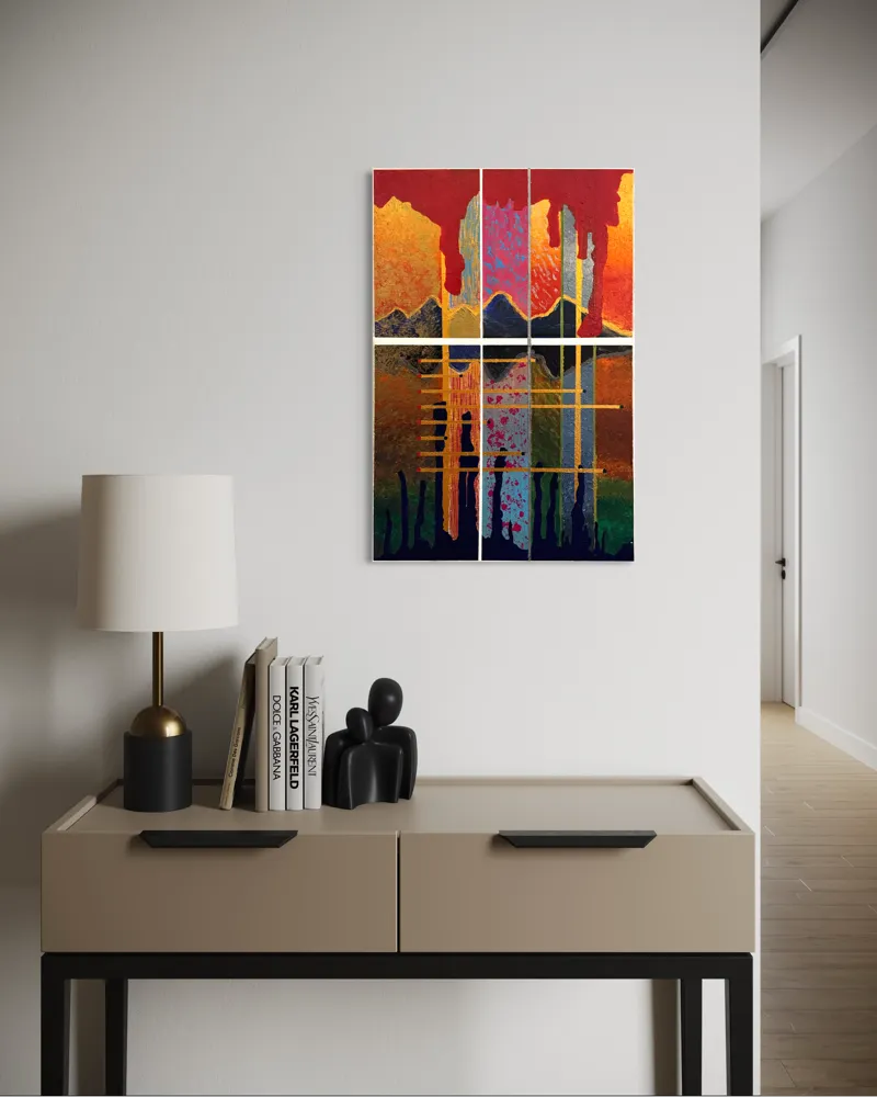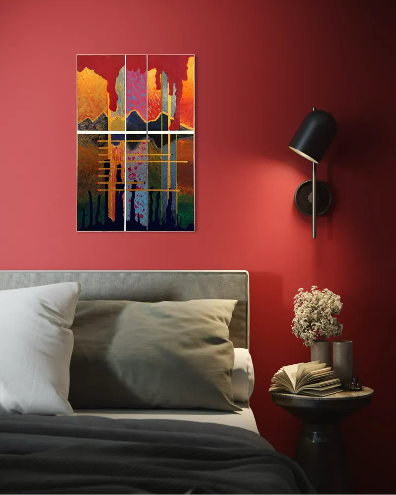 Színek: mély bordó–vörös és narancs–okker (aranyos) alaptónusok, élénk magenta/pink fröccsenések, türkiz–kékeszöld és világoskék mezők, sötétkék/indigó–fekete alsó foltok és csurgások, szürkés-ezüst függőleges elemek, arany sávok és fehér rácsvonalak, helyenként zöldes árnyalatok.