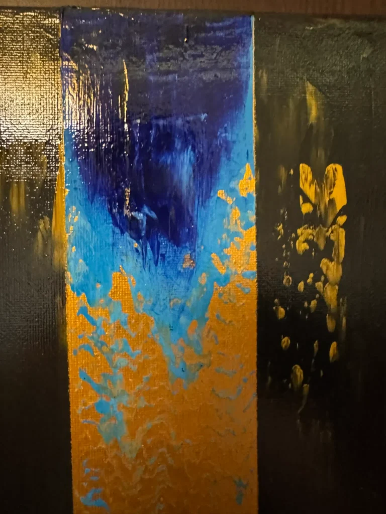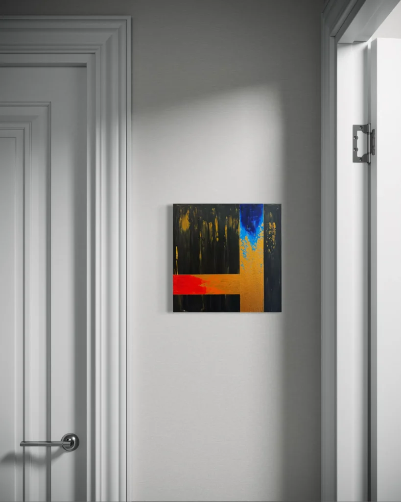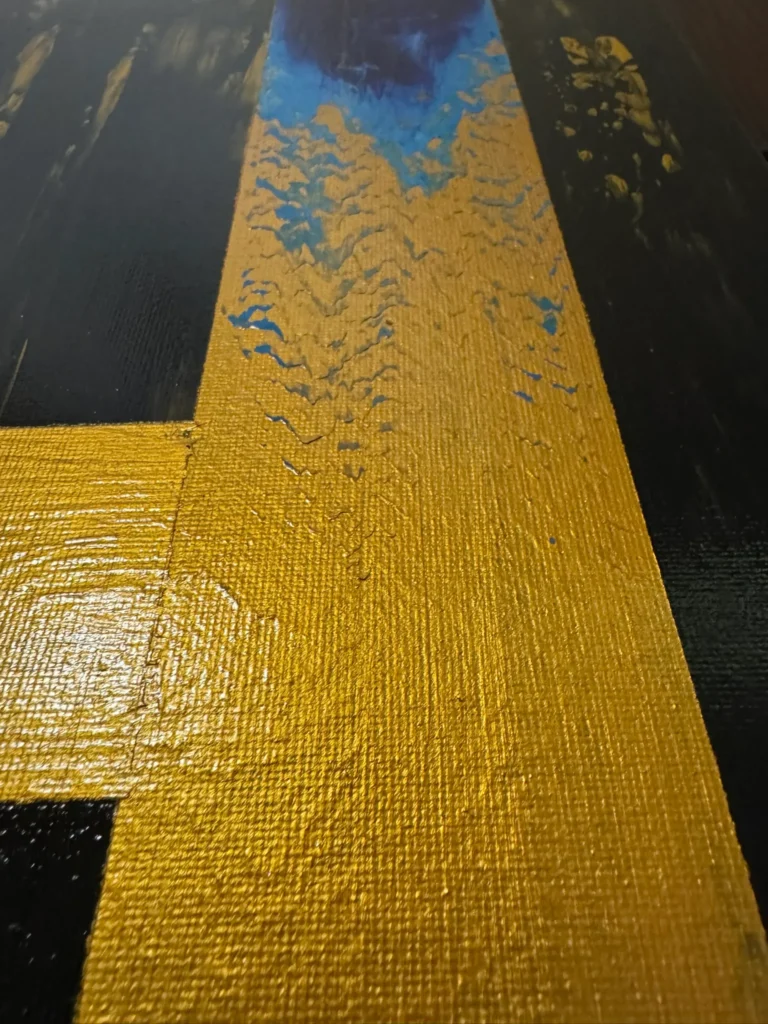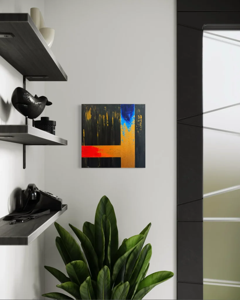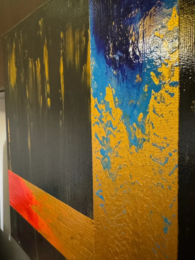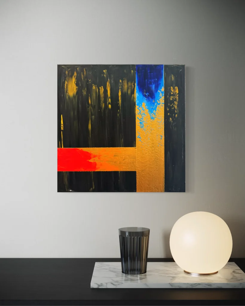 Színek: mély fekete–grafitszürke alaptónusok, arany–okker (fémes) felületek és sávok, élénk vörös–narancs vízszintes hangsúly, felül kobalt–ultramarin kék felvillanás, helyenként barnás–szürkés áttűnések.